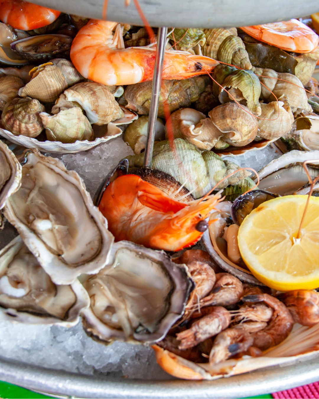 langoustines calibre 30/40, 500 g de bulots, 6 crevettes 60/80.